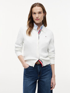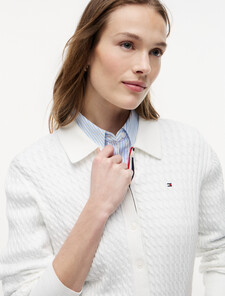 This cardigan made from pure cotton showcases a timeless cable knit design, subtly finished with a signature tape on the placket and a Tommy Flag embroidery on the chest.