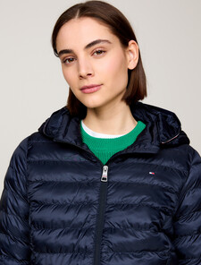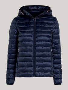 Stay warm and stylish with this lightweight padded jacket featuring Tommy Hilfiger's iconic global stripe. Its quilted design and practical features make it perfect for transitional weather.