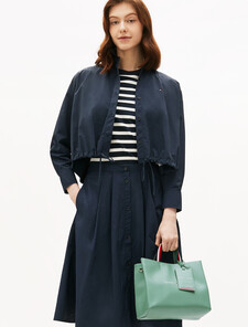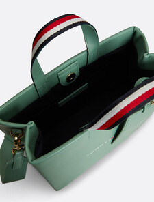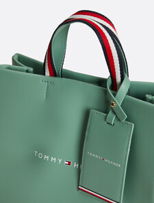 The iconic Tommy Hilfiger tote returns in smooth leatherette, featuring a matching strap and luggage tag for a bold, tonal look. With top handles and a detachable crossbody strap, it offers versatile carrying options for your essentials on the go.