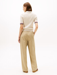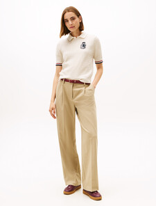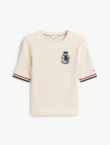 The knit cotton sweater features a fine cable knit design, accentuated with Tommy Crest embroidery.