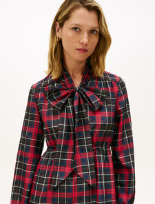 縐紗襯衫連身裙呈現優美垂墜感,結合品牌經典格紋設計與蝴蝶結領細節,輕鬆展現知性與柔美,可搭配西裝或牛仔褲。