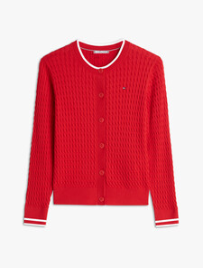 這款純棉開襟外套主打經典的圓領設計,正面有鈕扣開襟,絞花針織衣身更添典雅格調。