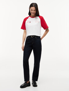 這款圓領T恤配有對比色連肩袖,搭配極速奔馳的圖案。